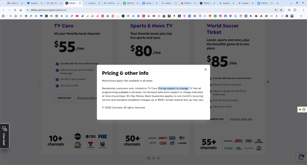 - Prices on Xfinity website are mis-leading as they don’t show the normal price but already show the $10 off bundled discount price. IE TV Core regular price is $65, not the $55 they have in the big bold numbering.